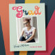 Trendy retro photo, graduation announcement postcards, featuring design elements of vintage style typography reading "Grad" in boho colors of the rainbow. The graduates photo is highlighted with thin white boarders. Light mint green background color or easily edit and change the color as needed. The back of the card offers personalized text spaces for information about your graduation. Perfect for the high school, college and university grad.
