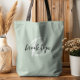 This elegant personalized tote bag features a monogram and first name in modern black and white script on a trendy sage green background.