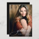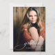 This trendy stylish graduation announcement features beautiful script text spelling out the word graduation with a text template to personalize with the name, school and graduating year. Load your desired vertical photo in place of the sample photo shown in the design template. The back of this announcement has been intentionally left blank. You can customize further by adding additional text on the back of the card if you desire.