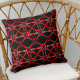 Modern throw pillow design featuring a seamless pattern composed of geometric shapes in red and pink on a black background.