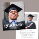 A budget-friendly modern graduation announcement and party invitation that features your grad's photo overlayed with "Graduate" in trendy large white text and their name, school and class year in simple white typography. On the back, add an additional photo and the grad party details.