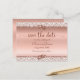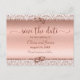 Trendy modern script typography announces your upcoming wedding date. Rose Gold metallic background is edged with glitter damask, which is accented with rose gold wedding rings.