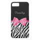 A trendy black and white zebra print Barely There iPhone 7 Case decorated with a picture of a chic hot pink ribbon tied into a girly bow. Personalize this fashionable pink and black animal print design by adding the name of your favorite girl. Flat printed image, NOT actual bow.