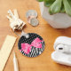 A trendy black and white zebra print with a chic polka dot pattern keychain embellished with a stylish hot pink ribbon tied into a cute girly bow. This modern and girlie animal print and polkadot fashion accessory is a flat printed image and does not contain an actual ribbon.