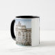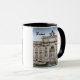 White and black 11 oz. combo mug with an image, on both sides, of the Trevi Fountain in Rome, Italy, designed by Italian architect Nicola Salvi and completed by Pietro Bracci in 1762.