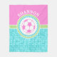 Cute personalized girl's soccer fleece blanket with a cool tri-colored pastel design. There is a soft pink, lovely green, and incredible aqua in this design. It also has a pretty pink soccer ball in the middle! Use the custom text field to add a name before you order. Or if you prefer, leave the text field blank for no name.