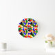 This wall clock has a Bauhaus design of a collage of triangles in red, yellow, orange, blue, and green.