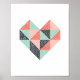 This modern wall art would look wonderful on it's own or as part of a gallery wall. This design features a heart shape made of triangles in mint green, coral pink and black patterns.