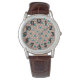 This men's watch has a geometric design of repeating brown and tan triangles with turquoise circles on top on a field of off-white. Want the same design in different colors? Message me.