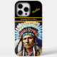 A Native Indian stands proudly, adorned in traditional attire and a vibrant feathered headdress. The intricate designs and colors reflect deep cultural significance, capturing a moment of heritage.