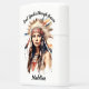 Wearing a vibrant headdress, a Native Indian woman gazes intently into the distance. Her traditional dress is adorned with intricate patterns, showcasing her cultural heritage and strength.