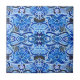 Ceramic tile in a batik pattern of repeating shapes, with a tribal inspired theme, in shades of indigo and sky blue, on a white background