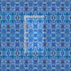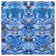 Fabric in a batik pattern of repeating shapes, with a tribal inspired theme, in shades of indigo and sky blue, on a white background