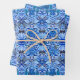 Wrapping Paper Sheets in a batik pattern of repeating shapes, with a tribal inspired theme, in shades of indigo and sky blue, on a white background