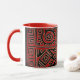 A bold red and black tribal-inspired design featuring spirals, diamonds, and hand-like shapes arranged symmetrically, evoking ancient and cultural art motifs.