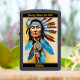 A majestic scene captures a Native Indian warrior with a serene expression, wearing a striking headdress of colorful feathers. Dreamcatchers and cultural symbols enhance this beautiful representation.