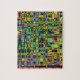 This challenging jigsaw puzzle flaunts an abstract tapestry in a variety of shades of blue, pink, purple, yellow, green, black and more more!