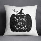 Celebrate Halloween in style with this "trick or treat" seasonal throw pillow featuring modern script lettering on a black rustic textured pumpkin.