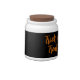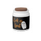 Candy jar with flowy “Trick or Treat” scripted orange text and happy ghost peaking in from the side.