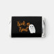 Hershey’s mini chocolate with “Trick or Treat” written in an orange flowy script with a friendly ghost peeking in from the side.