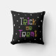 Halloween accent pillow featuring the text: "Trick or treat" in white, orange green and purple letters surrounded by stars on a black background. All colors are customizable in the design tool.