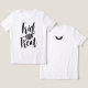 Celebrate halloween with our cute and sassy trick or treat typographic script t-shirt. The design features our own typographic design featuring the words" Trick or Treat" A simple stylized pumpkin silhouette is placed between the trick and treat type treatment. "Or" is incorporated onto the pumpkin silhouette. Stylized bats add to the halloween theme. The reverse side features a simple black stylized bat placed on the back of the t-shirt. All illustrations contained in this fun, sassy halloween pumpkin typographic trick or treat theme t-shirt are hand drawn original artwork by Moodthology.