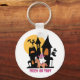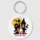 A charming and spooky Halloween illustration featuring a cute ghost wearing a pink cowgirl hat, riding a small brown pony in front of a silhouette of a haunted house under a glowing full moon. The text below reads "TRICK OR TROT". The scene also includes silhouetted bats, a witch flying on a broomstick, and two floating ghosts, combining Western flair with traditional spooky elements.