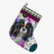 Christmas stocking with Tricolor Cavalier king charles spaniel art design. floral. Holiday Art stocking. green and magenta colors. checker traditional pattern.
