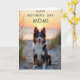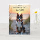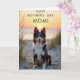 This card features a tricolor domestic dog sitting front and center on a sandy beach, its black, white, and warm russet coat catching the soft light like a gentle glow. The dog looks straight out with bright amber eyes and an open-mouthed grin, tongue showing, giving the scene a friendly, affectionate feel ❤️. Fine fur details stand out along the head and shoulders, where the low sun creates a light rim that feels like a quiet hug. The sand around the paws shows small ripples and shallow grooves, adding calm texture to the foreground. A few thin tufts of beach grass rise on either side, framing the dog like companions in the breeze 🌼. Behind, a golden sun sits near the horizon over smooth water, while the sky blends peach, cream, and soft orange tones. Across the upper portion of the sky, the message “HAPPY MOTHER’S DAY MOM!” appears in a casual hand-drawn style, set in a dark contrasting color for easy reading. The sun’s round edge glows above the waterline, with pale reflections stretching toward the shore.