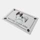 Destei's original cartoon illustration of a tricolor coat color Papillon breed dog on a light gray background color. The design is framed by stylish double border lines. There is a dog paw print silhouette in each corner as well. Under the image there are two personalizable text areas. The colors of the paw prints, border, text and background can be changed to any other color, if so wished.
