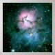 Space photography - the Trifid Nebula in pink against a field of stars.