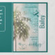 Stunningly beautiful formal wedding invitation with a beach theme and palm trees throughout! The front holds a modern design with your names and general invite. The center holds your favorite engagement photo, details, events, accommodation information - all text that is easily updated, and more lovely palm trees. The back holds RSVP information and a lovely quote about the ocean. All sides are set off with lovely teal-colored font and borders. An invite that will certainly generate excitement - look for the response card and coordinating products in our store!