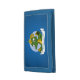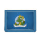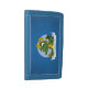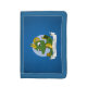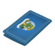 Personalized TriFold Nylon Wallet with illustration of head of a cute little green dragon in blue circle on blue background, cute fantasy / fairy-tale design for kids by Maxi Harmony, with customizable text template for your name or message