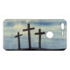 A watercolor painting of three crosses silhouetted against an evening sky adorns this phone case.