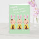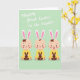 The front design shows three matching cartoon-style babies sitting side by side on a soft light-green background, arranged evenly like a sweet little trio. Each baby wears tall bunny ears in white with pink inner details 🐰, and their sunny yellow outfits make them look cozy and close, as if they’re sharing the moment together. Their dot eyes face forward, and the blush on their cheeks adds a gentle, friendly warmth, like the kind you see when family or close friends lean in for a photo. The two babies on the sides have small closed smiles, while the baby in the center smiles with an open mouth, giving the group a lively, affectionate contrast. Resting in each baby’s lap is a tiny dark-brown rabbit figure 🐇, held carefully as though it’s a treasured little companion. Near the top of the design, a short greeting appears in white, slightly angled lettering that stands out clearly against the green. Tiny feet with pink paw-pad details peek out at the bottom of the yellow outfits.