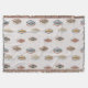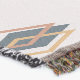 This throw blanket has a mid-century modern design of sets of two diamond outlines with one solid diamond, in greys, gold, orange, blue, and tan, scattered about the design on a field of off-white. If you like the design but prefer different colors, message me.