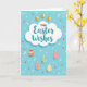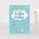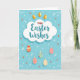 This greeting card features a soft white cloud centered on a calm sky-blue background, setting a gentle scene that feels like a shared springtime moment 🌷. Inside the cloud, the words “Easter Wishes” appear in flowing white lettering, with “Triple” placed just above it in a slightly thicker style that stands out. Three shiny golden egg shapes float above the cloud, their highlights giving them a sweet, gift-like glow. Hanging below on thin white strings are five decorated eggs, arranged like a little group gathered close together, as if keeping each other company 🐰. One egg shows orange and cream stripes, another has small floral details on mint green, and the others mix soft pinks and creams with polka dots and starburst accents. Tiny white dots and short orange dashes are scattered across the background like confetti, adding movement around the eggs and cloud. Light shadows sit beneath the cloud and each egg, and the lower eggs dangle evenly with the strings leading up toward the cloud.