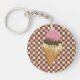 Neapolitan ice cream flavors, vanilla, chocolate and strawberry, in a cone with the same colors in a checkerboard background.