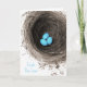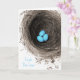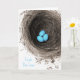 Photograph of a bird's nest with 3 blue speckled eggs resting inside.