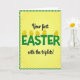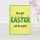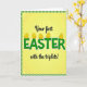 Designed with a sunny yellow center that fades softly like spring light, this card is framed by a green-and-white gingham border that feels cozy and familiar 🌷. Near the top and bottom of the main message, the smaller words “Your first” and “with the triplets!” appear in thin black flowing lettering, giving the layout a gentle, affectionate tone. Centered between them, “EASTER” stretches across the middle in large green letters with a white outline and a lightly hatched texture. The spacing keeps the big word as the focal point while the smaller lines tuck in close, like a warm note wrapped around it. Perched along the tops of the green letters are five golden-yellow egg shapes, each with wavy brown lines, as if they’re carefully set there for someone special 🐰. The mix of soft yellow, fresh green, and warm gold creates an inviting scene that suggests closeness and shared excitement without needing extra decoration. The eggs sit like little crowns above the word “EASTER,” evenly spaced across the letters against the glowing yellow background.