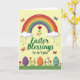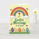 Designed with a soft pale yellow backdrop, this digital illustration centers on a rainbow arcing from deep red through violet, setting a friendly spring scene 🌷. At the rainbow’s base, two fluffy white clouds sit like gentle companions, with small blue drops hanging beneath them as if a light shower is falling. Beneath the arc, a red heart on a slender green stem rises like a little flower, adding a romantic touch to the garden setting. Near the top, four stylized butterflies in orange, blue, and magenta drift across the sky, their spacing suggesting they’re circling one another in an easy, affectionate dance 🐇. Across the middle, green lettering reads “Easter Blessings For the Triplets,” placed prominently over the scene so it’s the first text you notice. Along the bottom, a strip of green grass stretches across the foreground, sprinkled with small, simple blossoms in multiple colors. Nestled in the grass are three decorated eggs: one deep purple with neat white dots, one orange with star shapes, and one teal with geometric band patterns.