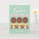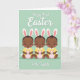 This card shows three matching infants lined up evenly across a mint-green background, creating a sweet sense of togetherness like close friends sharing the same moment. Each baby has warm brown skin, short curly hair, rosy cheeks, and wide shining eyes, and they wear sunny yellow smocks that stand out gently against the cool backdrop. Oversized bunny ears in white with soft pink centers sit upright on their heads, adding a festive touch 🐰. In their small hands, each child holds a plush pink bunny, hugged close in a way that suggests comfort and affection between them. Centered near the top, the words “Happy First Easter” appear in white flowing lettering, spaced nicely above the trio. Near the bottom, “To the Triplets” is written in matching white text, aligned to balance the design and keep the layout calm and tidy 🌷. Subtle shading under the figures and bunnies gives a slight layered look, and the pastel palette stays gentle with mint, yellow, white, and pink throughout. The three pink bunnies have simple smiling faces, with tiny dot eyes and small curved mouths.