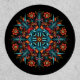 Trippy psychedelic patch with a groovy mushroom mandala with eyes and flowers. The funky style of this illustration resembles hippie art from the sixties.