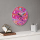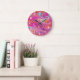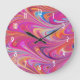 A clock with a cool trippy psychedelic design. Pink, orange and hints of blue all swirling around. Retro hippie vibe.
