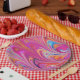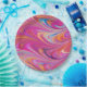 Paper plates with a cool trippy psychedelic design. Pink, orange and hints of blue all swirling around. Retro hippie vibe.
