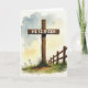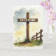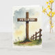 Designed with a soft watercolor look, the artwork centers on a tall wooden cross with a weathered grain that feels timeworn yet steady. A horizontal beam cuts across the upright post, and bold white text is placed right on that beam so it stands out as the main message. The cross rises from a patch of fresh green grass mixed with earthy browns, where small shoots lean upward like they’re reaching toward something gentle and reassuring 🌷. Off to the right, a rough wooden fence angles back into the distance, adding a quiet, companionable sense of space, like a path meant for two to share. Above it all, the sky blends from pale blue into a warm yellow glow near the horizon, suggesting early morning light and a calm, close moment. The light is diffused and soft, letting the natural textures do the talking while the white lettering remains crisp against the wood. In the foreground, the grass is painted in layered green washes with a few thin blades and tiny sprouts curling near the base of the cross 🐰.