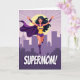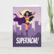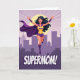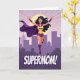 The front design shows a comic-style scene with a triumphant woman soaring mid-air, her dark flowing hair and bright blue eyes framed by a confident smile that feels like a warm, supportive hug ❤️. Her arms stretch wide as if she’s reaching out to loved ones below, and her pose suggests closeness and encouragement rather than distance. She wears a yellow-and-purple outfit with a short cape streaming behind her, plus tall boots and matching shorts, and the word “MOM” appears across her top in large letters. Behind her, a glowing yellow circle like a sun sits in the sky, sending rays outward across a soft lavender background. A simplified city skyline in deep purple runs along the bottom, making her flight stand out above the rooftops. Near the lower foreground, the word “SUPERMOM!” is placed in big white letters that pop against the darker tones 🌼. The cape arcs to the right in a sweeping curve, with yellow rays fanning out around her against the lavender sky.