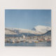 Photograph of the city of Tromsø covered in Snow: Tromsdalen with The Arctic Cathedral and Tromsdalstinden in the background (Scandinavia, Europe).