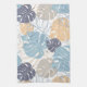 Kitchen towel with tropic pattern of blue and yellow monstera leaves.