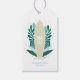 Surfs up! Tropical surf themed baby shower thank you gift tag with a natural wood grain surfboard and tropical leaves in shades of aqua and green.